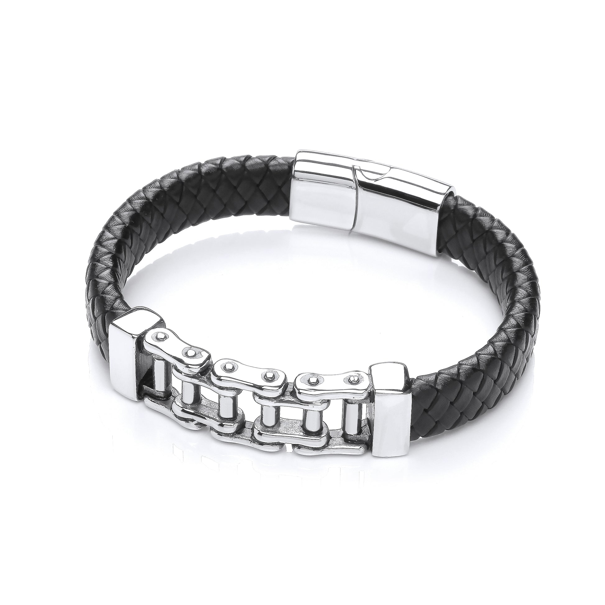 Gents Black Leather Plait Bracelet With Steel Design Clasp