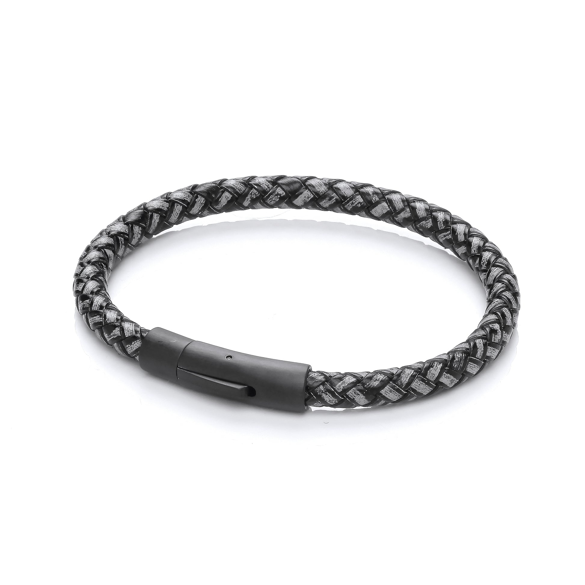 Gents Black Leather Plait Bracelet With Steel Design Clasp