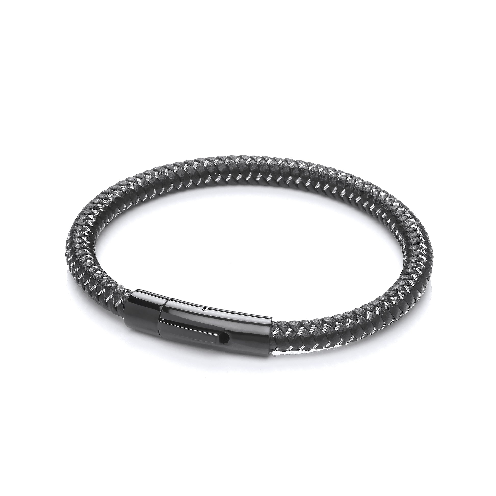 Gents Black Leather Plait Bracelet With Steel Design Clasp