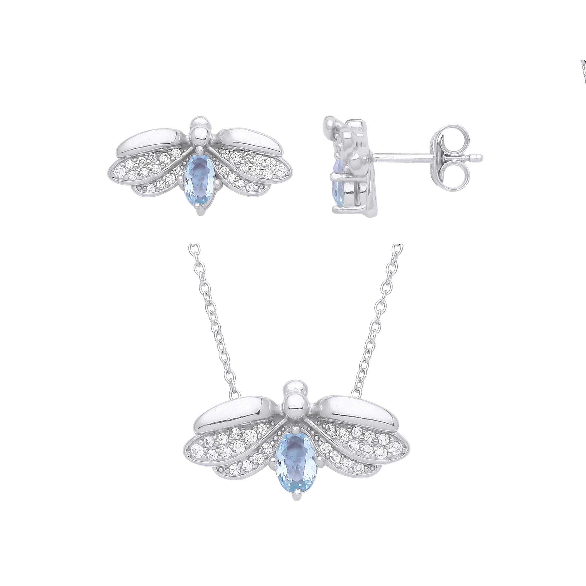 Stud 925 Sterling Silver Rhodium Plated Colourless & Aqua Cubic Zirconia Earring & Pendant Set
